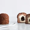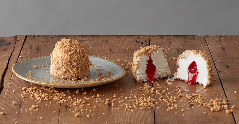 Semifrío de Philadelphia con un corazón de fresa líquido y una capa de crumble de galletas digestivas