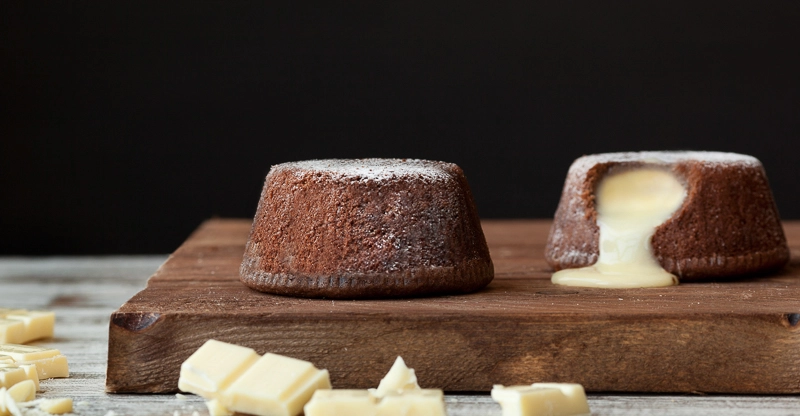 Soufflé de chocolate negro con un delicioso corazón de delicada crema de chocolate blanco.