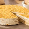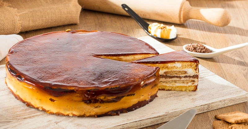 Tiernas capas de galleta bañadas en café con chantilly de nata y trufa con dulce de huevo, decorada con una fina capa de cobertura de caramelo.