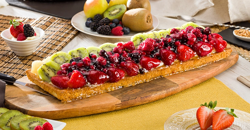 Trancio de masa quebrada y bizcocho rellena con crema pastelera, recubierta con una deliciosa selección de frutas y gelatina de albaricoque.