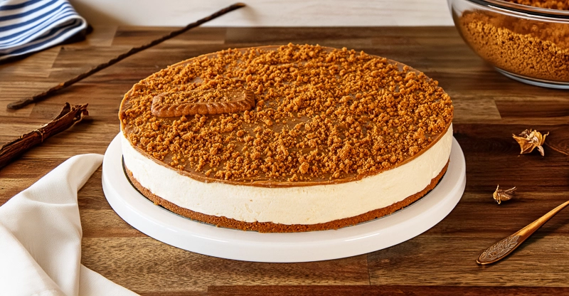 Base crujiente de galleta Lotus, bajo una deliciosa crema de queso, coronada por crema de galleta de galleta Lotus y polvo de galleta caramelizada.